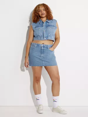 Cette jupe est confectionnée à 20 % en coton recyclé en utilisant des techniques à faible impact environnemental peu coûteuses en eau, en énergie et limitant la production de déchets.